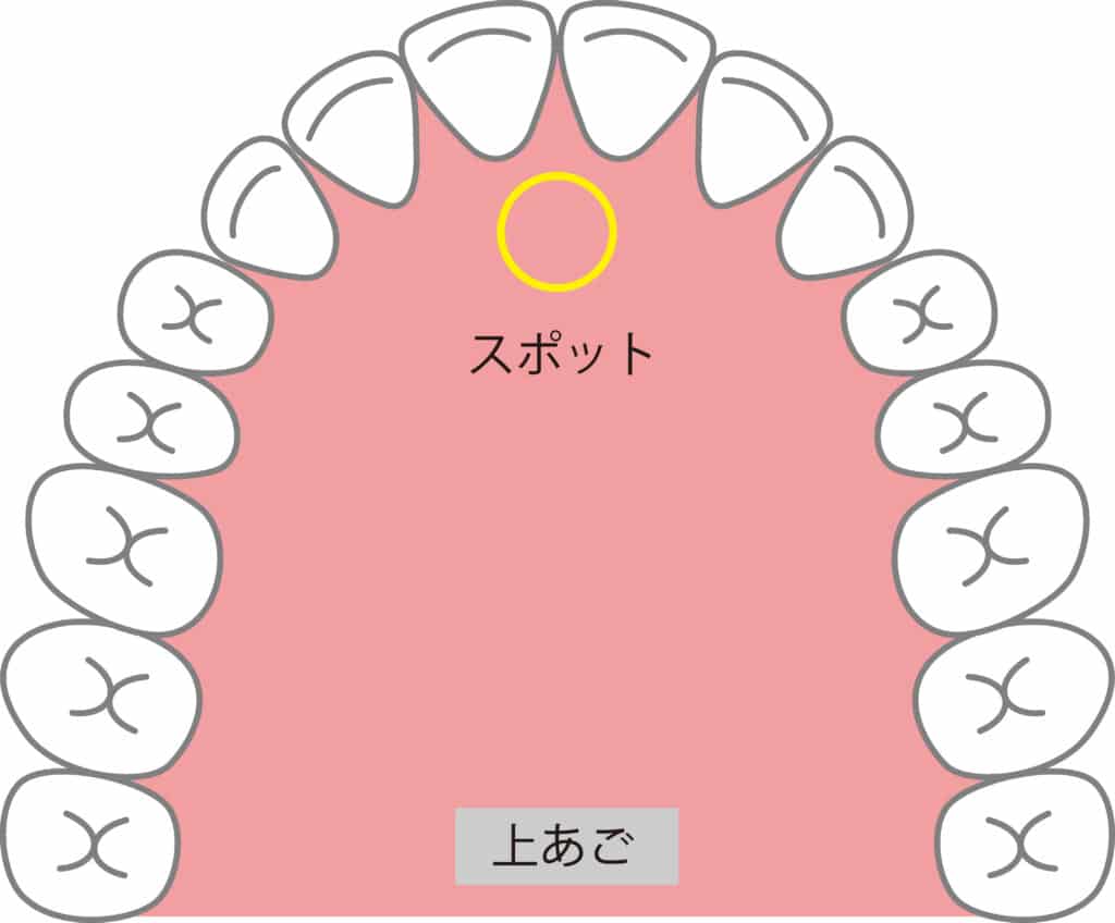 正しい舌の位置はリラックスしている時に、舌先が上の前歯の裏側(凹んだところ)にあります。この位置を「スポット」といい、舌全体が上顎にピタリと付いた状態です。