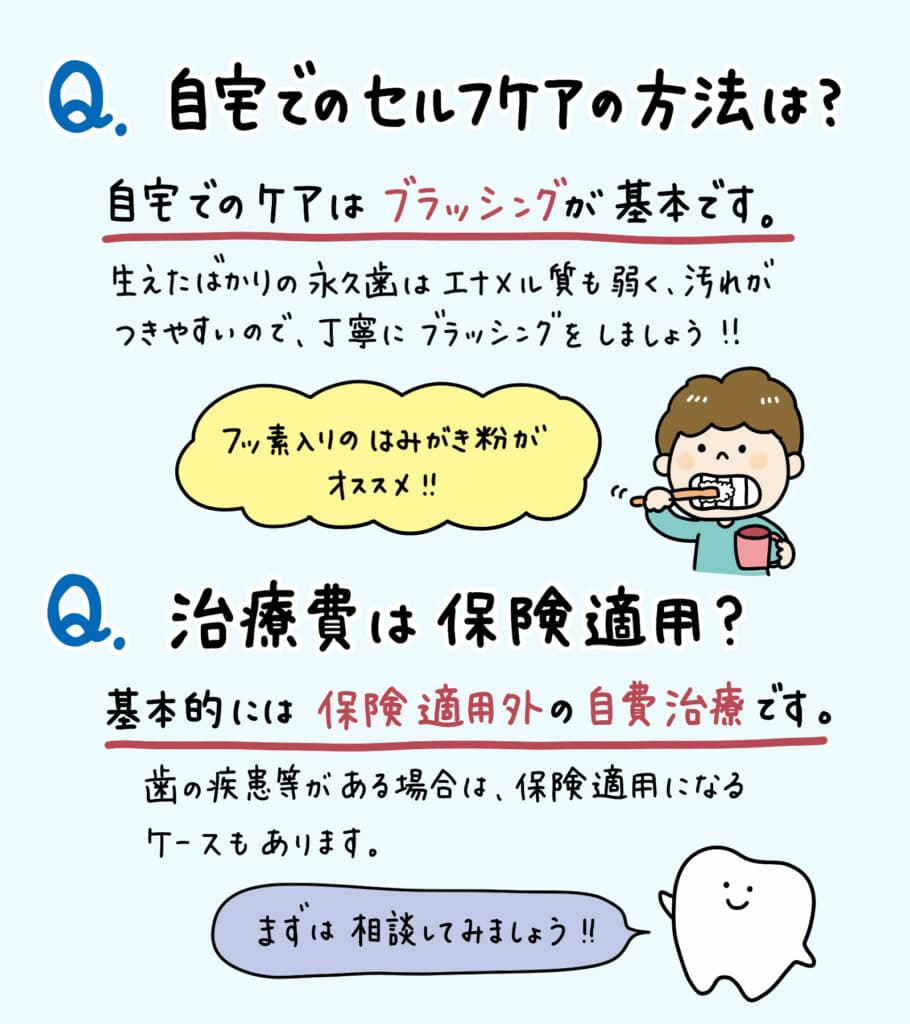 特に生えたばかりの永久歯は歯質が弱く、酸に対する抵抗力が弱い特徴があり、虫歯になるリスクが高まります。